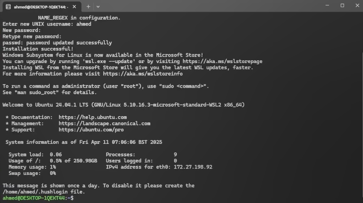 Once successfully configured, your new username will be displayed as part of your terminal prompt (for example, yourusername@DESKTOP-XXXXXX:~$).Β